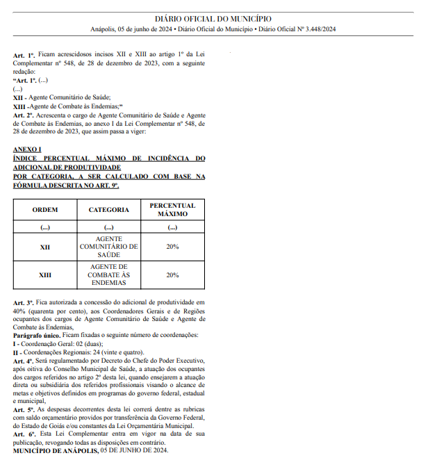 A lei que concede adicional de produtividade as categorias Agente Comunitário de Saúde (ACS) e Agente de Combate às Endemias (ACE) de Anápolis foi publicada nesta quarta-feira (5). A proposta surgiu por meio de mobilização do Sindsaúde junto a trabalhadores da categoria e foi aprovada em votação definitiva da Câmara Municipal de Anápolis no dia 27 de maio.