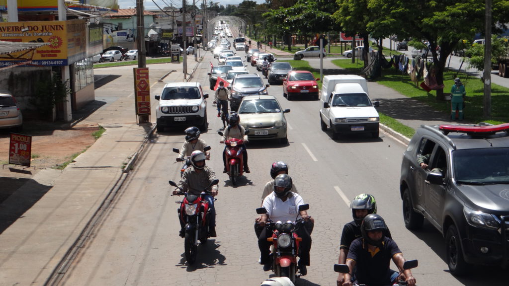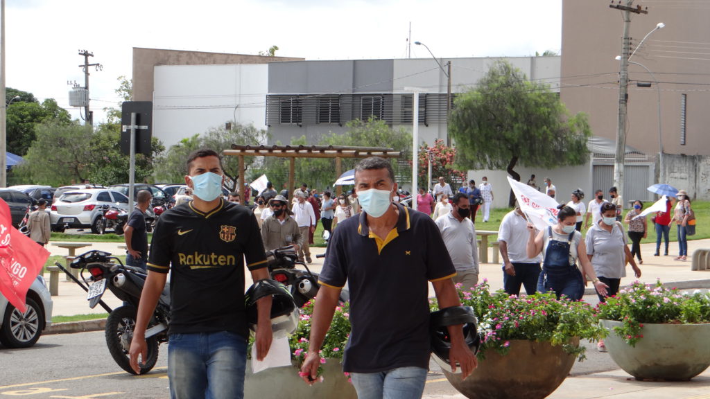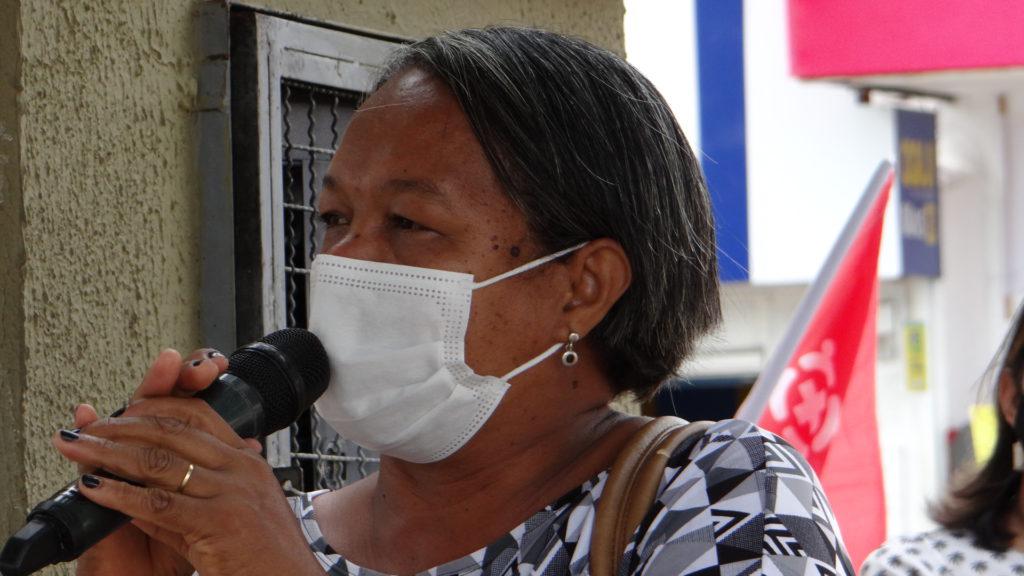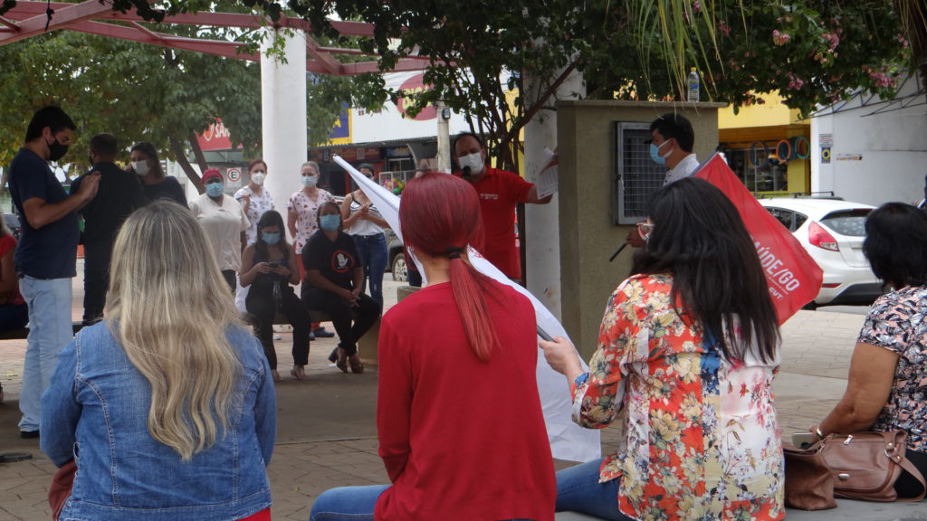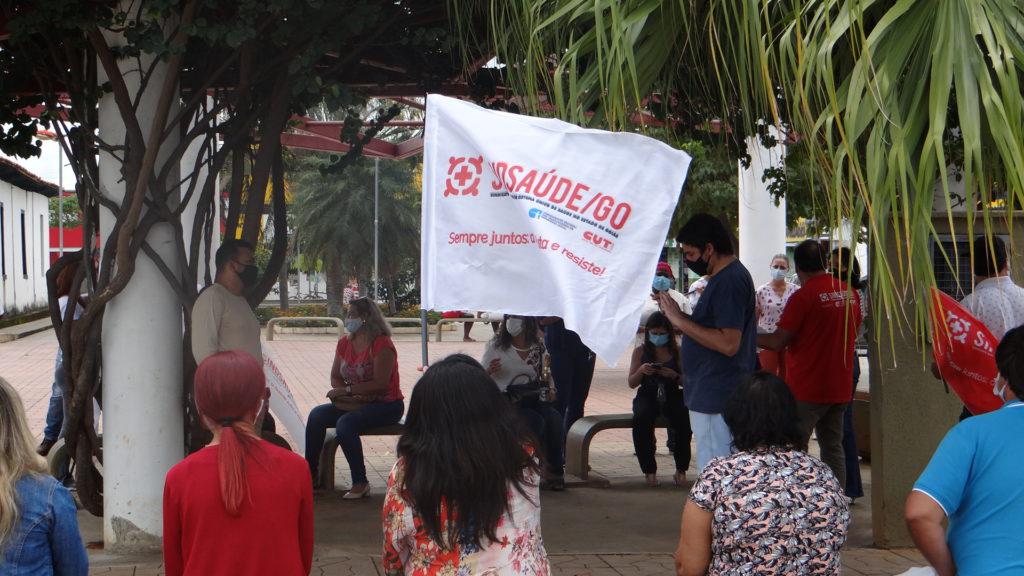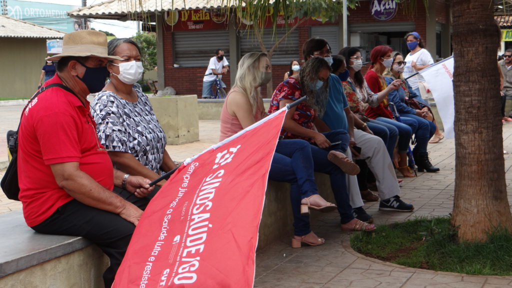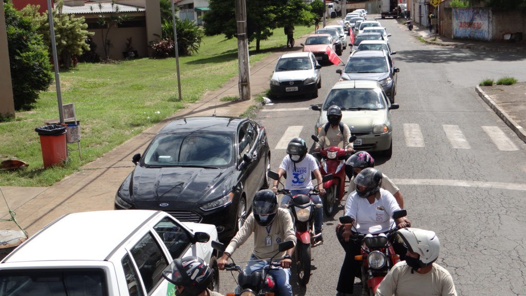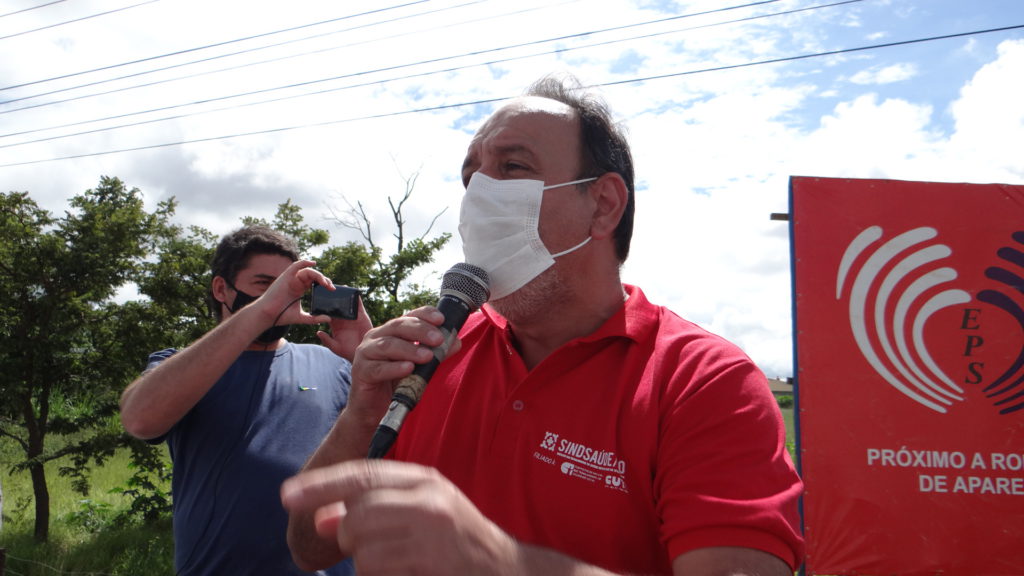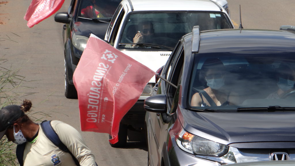 “Esse pessoal que está buzinando aqui são trabalhadores da saúde de Aparecida. Eles não tem condições de trabalho, estão com salários defasados, não estão conseguindo pagar suas contas no fim do mês. Não tá tendo gente pra atender vocês e o prefeito não faz concurso”, relatou no microfone a vice-presidente do Sindsaúde-GO, Néia Vieira.