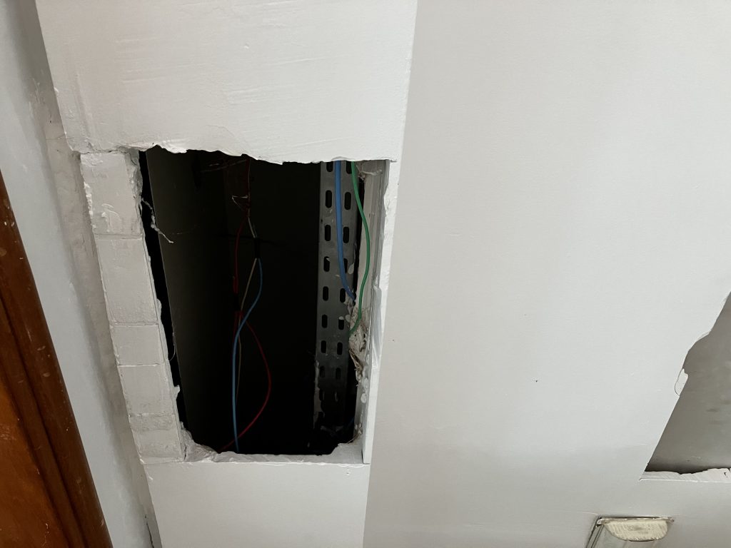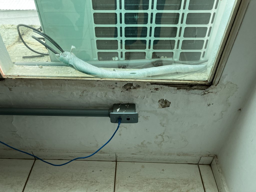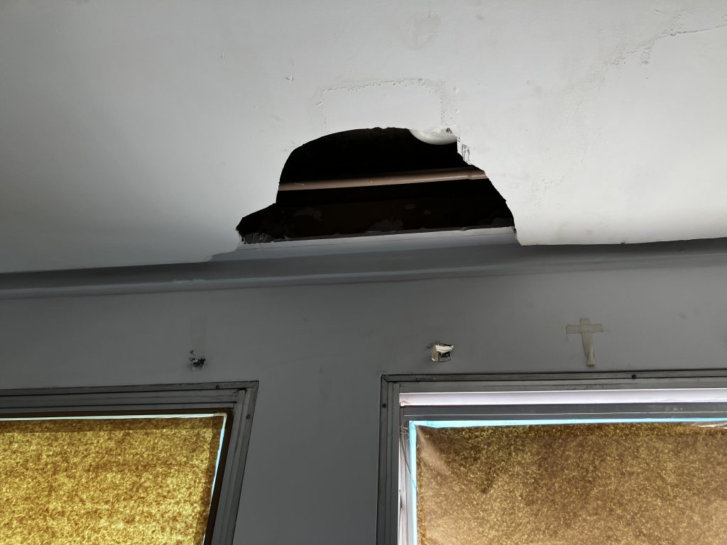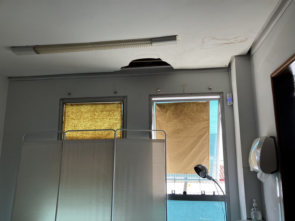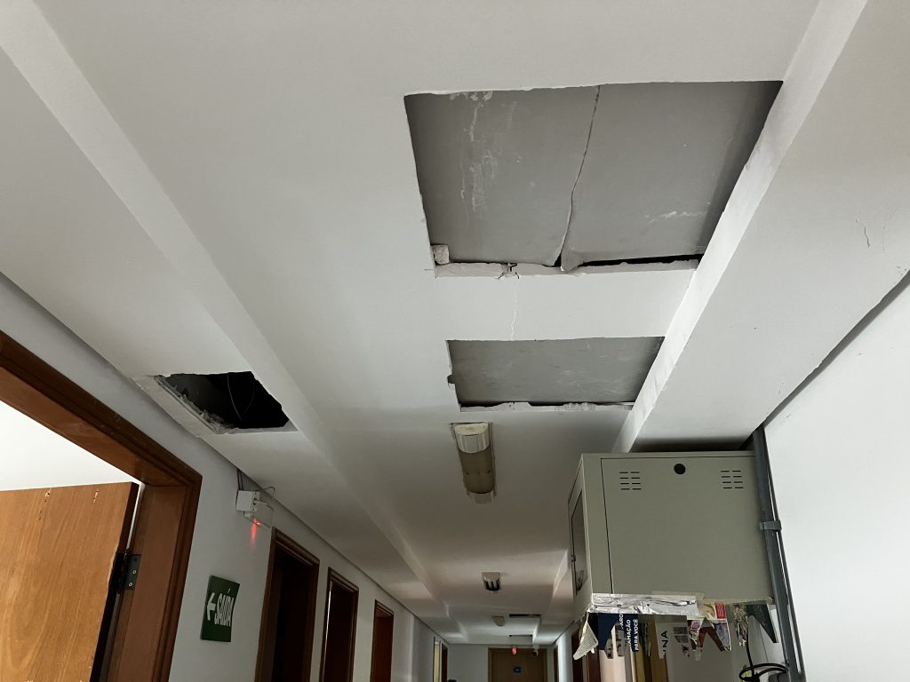 Durante a inspeção no CRDT, o Sindsaúde encontrou partes do teto caindo, extintor de incêndio com a data de validade vencida, paredes descascadas e com infiltrações. Os aparelhos de ar-condicionado existentes no local foram comprados e instalados por profissionais do serviço, pois o ar-condicionado central não funciona por falta de manutenção.