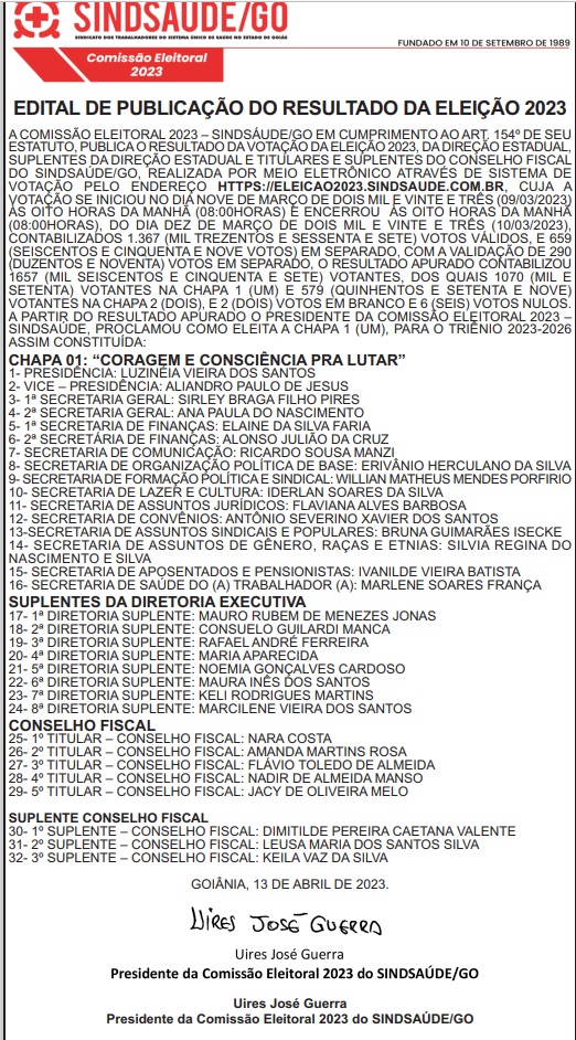 A Comissão Eleitoral do Sindsaúde-GO publicou nesta terça-feira (13), na edição do jornal O Popular, na página 25, o resultado oficial da eleição 2023 para a Direção Estadual, suplência e Conselho Fiscal do Sindicato. A votação foi realizada nos dias 9 e 10 de março de 2023.