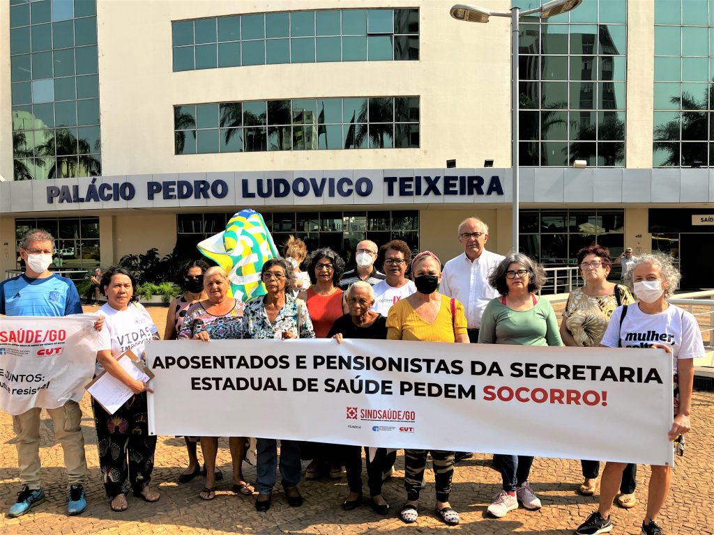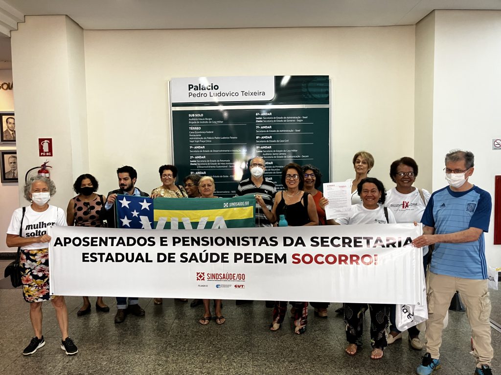 Na faixa conduzida pelo grupo, uma mensagem indigesta para o governo de Caiado: Aposentados e pensionistas da Secretaria de Estado da Saúde pedem socorro!