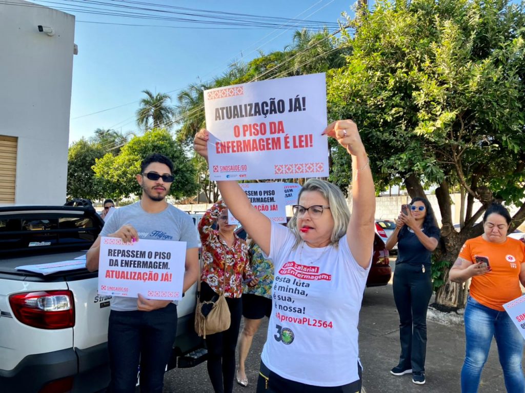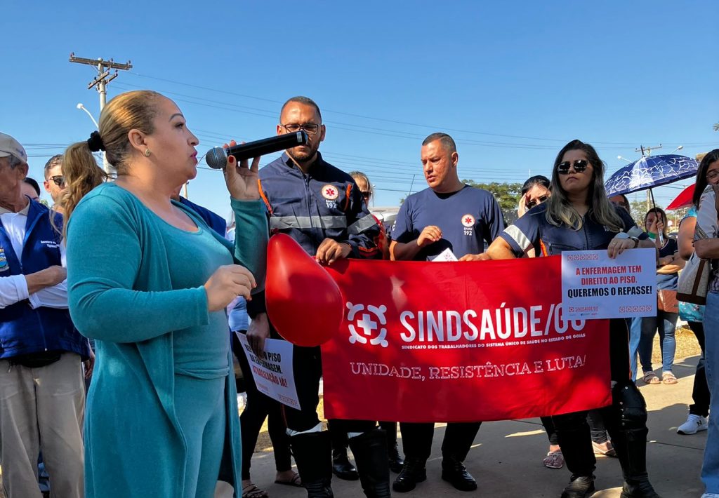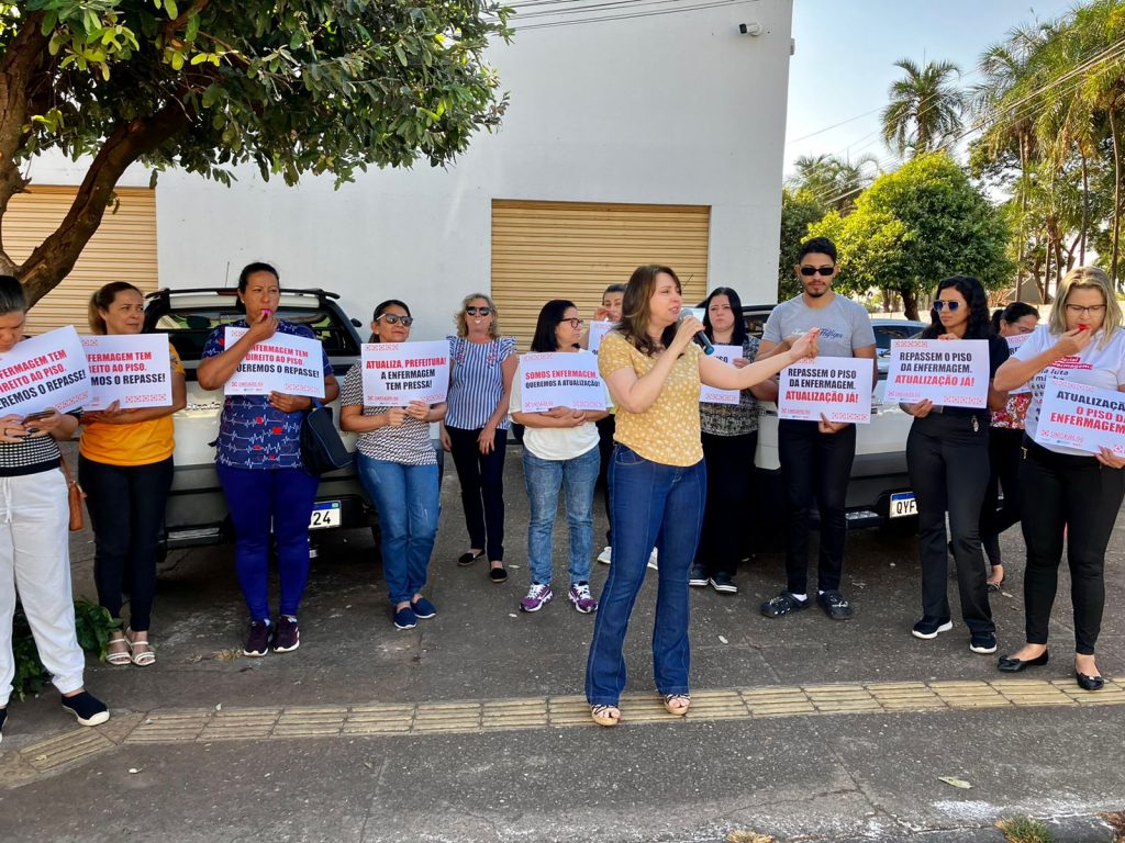 Antes iniciar a assembleia geral dos servidores da SMS, profissionais de enfermagem realizaram um ato em frente à Secretaria de Saúde para cobrar da pasta o repasse de informações ao Ministério da Saúde. Caso não efetue esse repasse, o Município deixará de receber a verba destinada ao pagamento piso da enfermagem.
