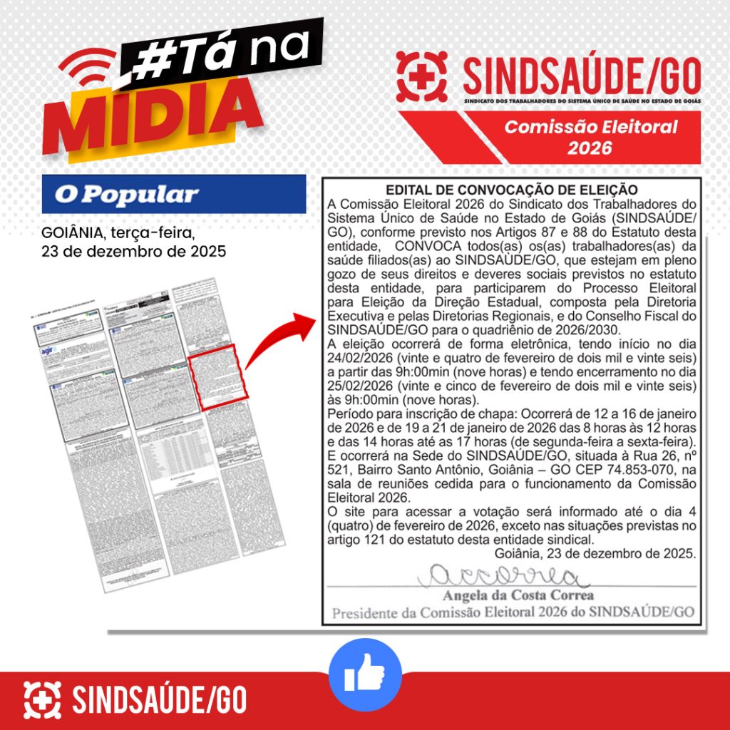 Nesta terça-feira (23), o Sindicato dos Trabalhadores do Sistema Único de Saúde no Estado de Goiás (Sindsaúde/GO) publicou o edital de convocação do Processo Eleitoral 2026, que irá definir a Direção Estadual (Diretoria Executiva e Diretorias Regionais) e o Conselho Fiscal da entidade para o quadriênio 2026/2030. A convocação é assinada pela Comissão Eleitoral 2026, conforme previsto nos artigos 87 e 88 do Estatuto do sindicato.