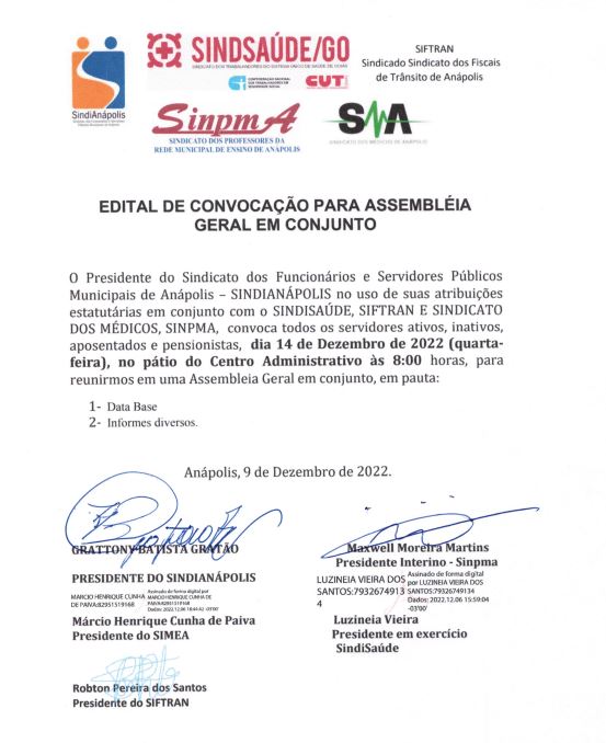 O Sindsaúde realiza na próxima quarta-feira (14), em parceria com o SindiAnápolis, Assembleia Conjunta Extraordinária para deliberar sobre as negociações da data-base do município. A reunião será realizada às 8 horas, no Centro Administrativo.